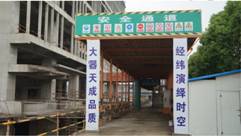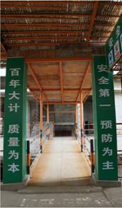 2.施工現(xiàn)場(chǎng)主要通道口安全防護(hù)長(zhǎng)廊,主樓底層施工道路設(shè)置定型化安全防護(hù)棚。